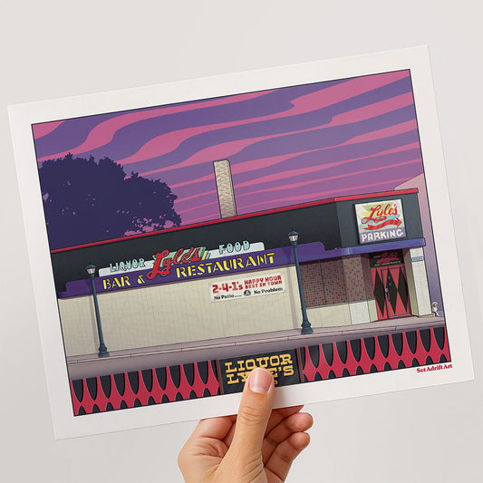 Tim’s work is often described as a colorful love letter to the state. From neighborhood dive bars and historic landmarks to peaceful lake scenes, his art captures the spirit and quirks of everyday places with warmth, humor, and a touch of nostalgia.