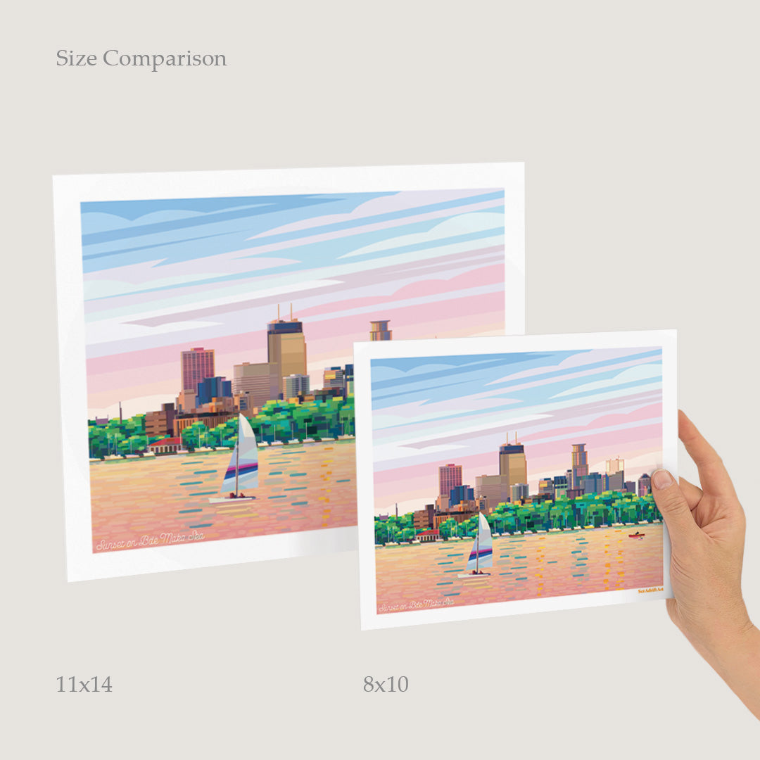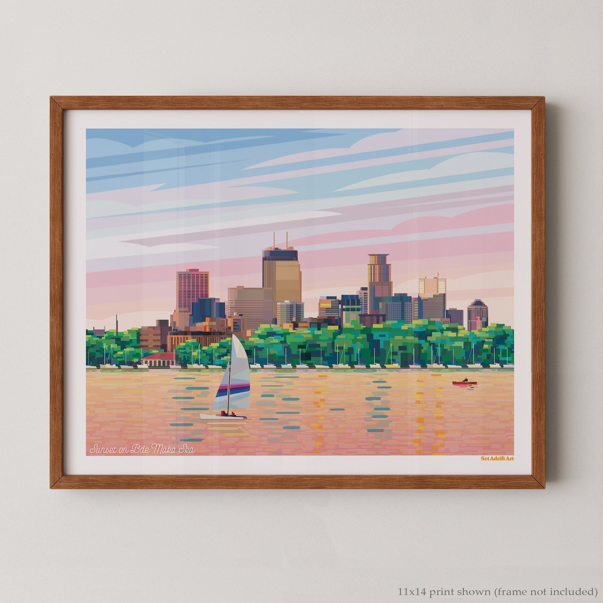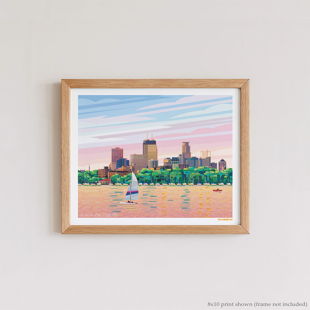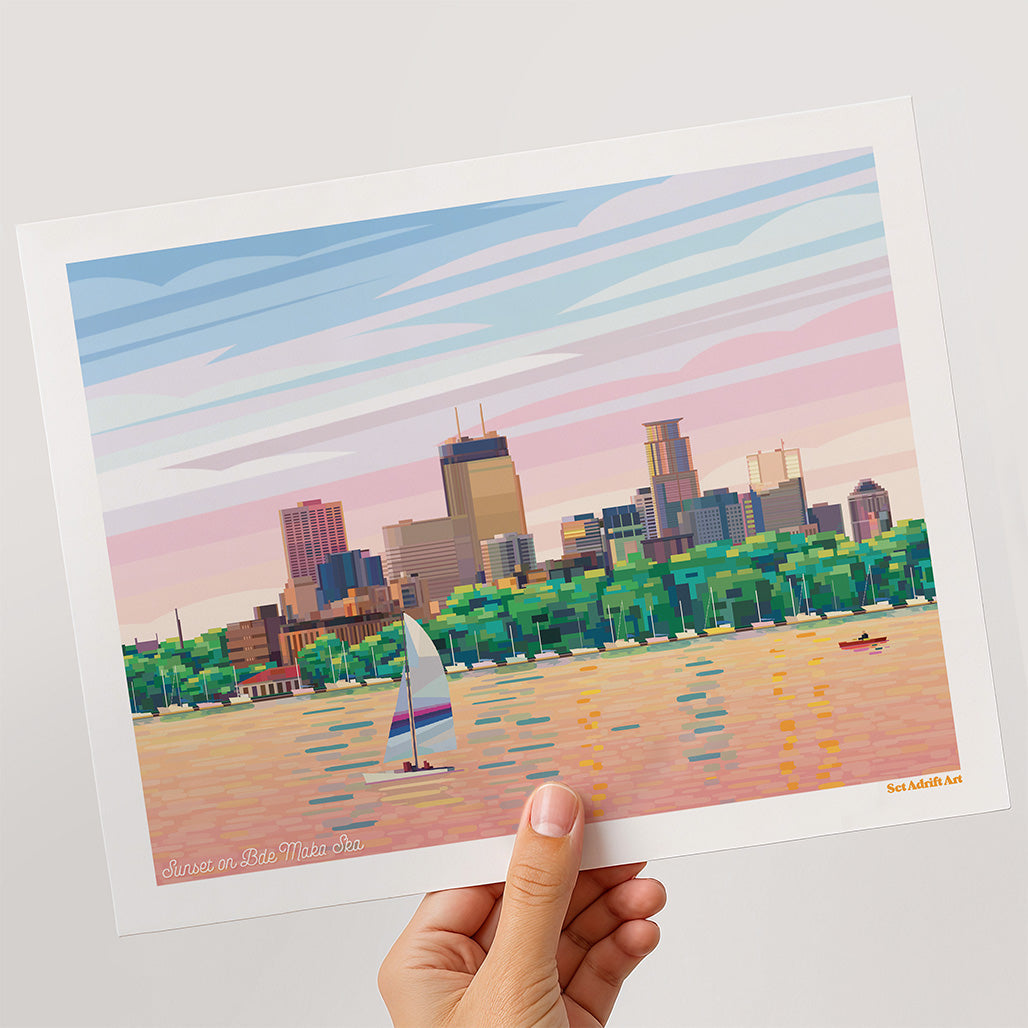 Bright colorful stylized scene of dusk on Bde Maka Ska with Minneapolis "The City of Lakes" behind.