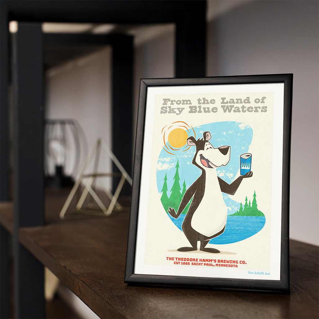 From the Land of Sky Blue Waters comes this vibrant, vintage-inspired art print featuring the beloved Hamm’s Bear. With bold colors and a modern twist on 1960s design, this piece brings a dose of nostalgia and charm to any space. Perfect for beer lovers, retro art fans, and anyone with a soft spot for Minnesota icons.