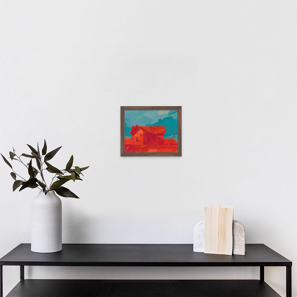 Inspired by western Minnesota's weathered prairie farmhouses, a bold red and orange building anchors itself in an abstract sky. This color palette defies the composition's simplicity.