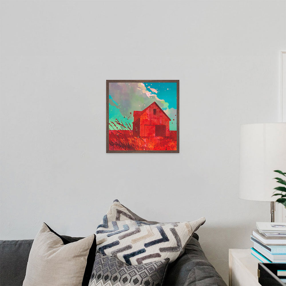 A vibrant, saturated red barn dominates this piece (originally acrylic on muslin painting). Bold brushstrokes create a simple, almost iconic structure. Abstract clouds in complementary colors fill the background sky. In the foreground, silhouetted big bluestem grasses sway, adding a sense of movement and texture to this striking and familiar Minnesota rural scene.