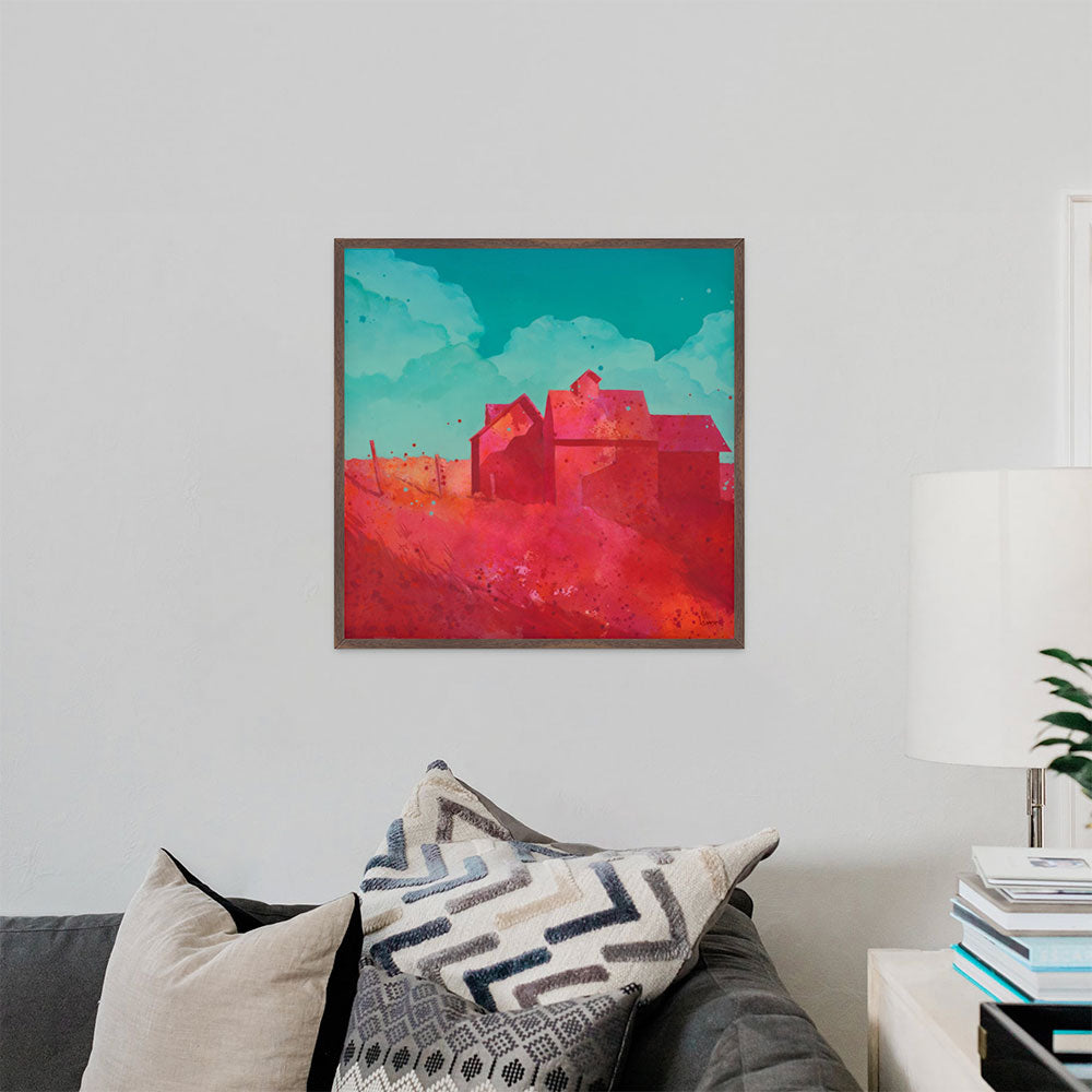 This piece (originally acrylic on muslin) captures the stark beauty of a desolate prairie, where a weathered farmhouse stands alone beneath a vast, turquoise sky. The bold red and magenta hues infuse the landscape with an almost surreal intensity, evoking both warmth and isolation in the open land.
