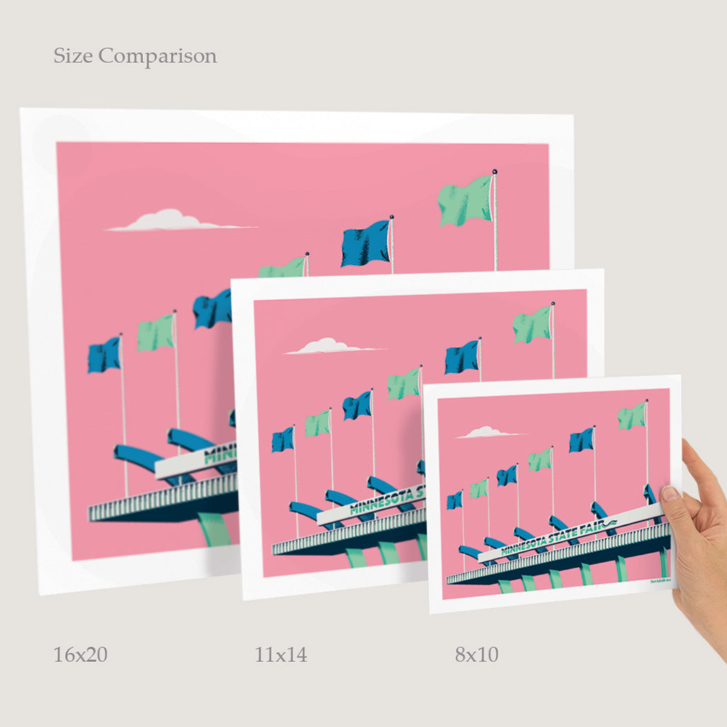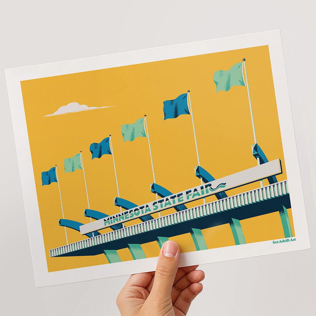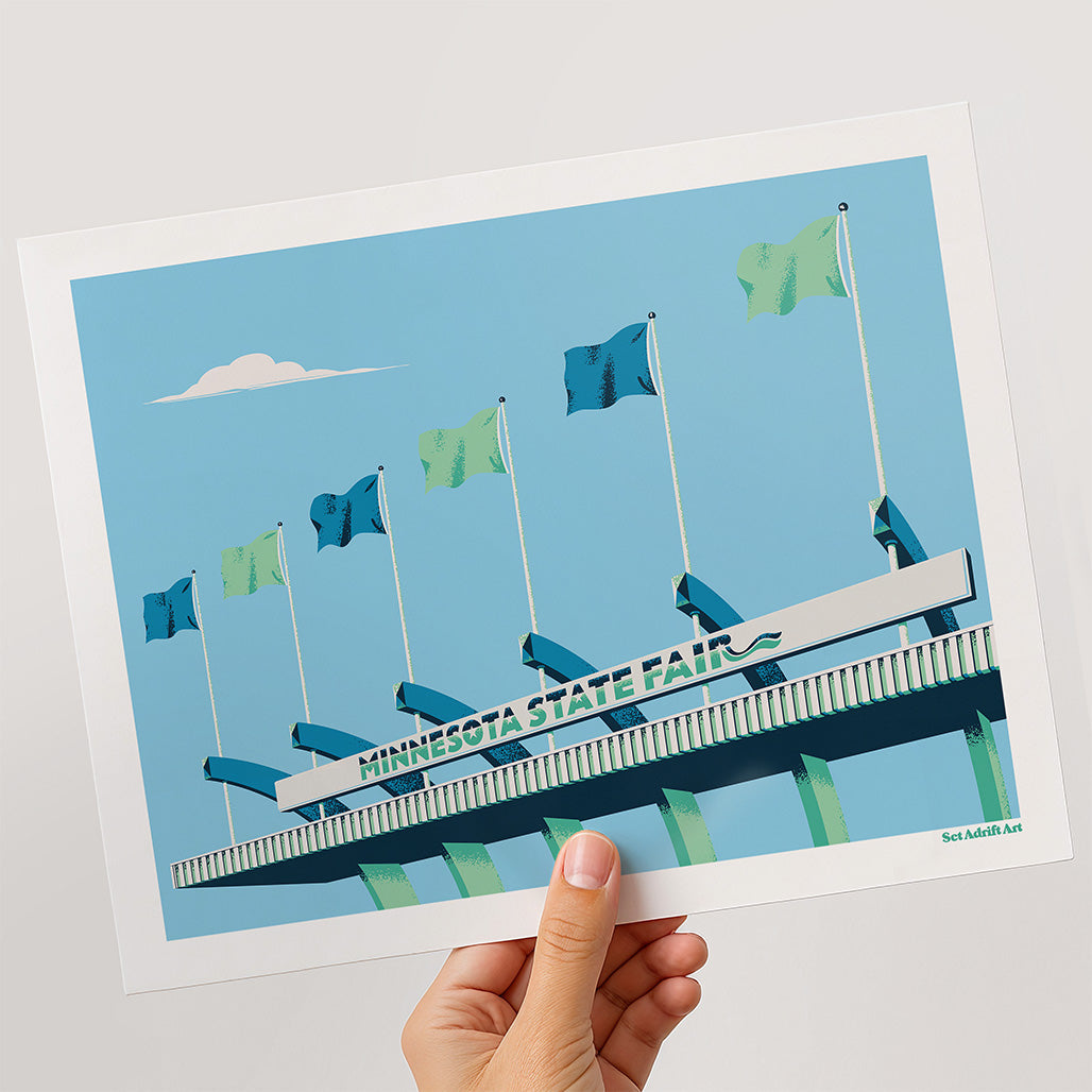 Capture the excitement of the State Fair with this vibrant print of its iconic entrance gate. A beloved Minnesota landmark, the gate welcomes millions each year to food on a stick, giant pumpkins, concerts, and endless people-watching.