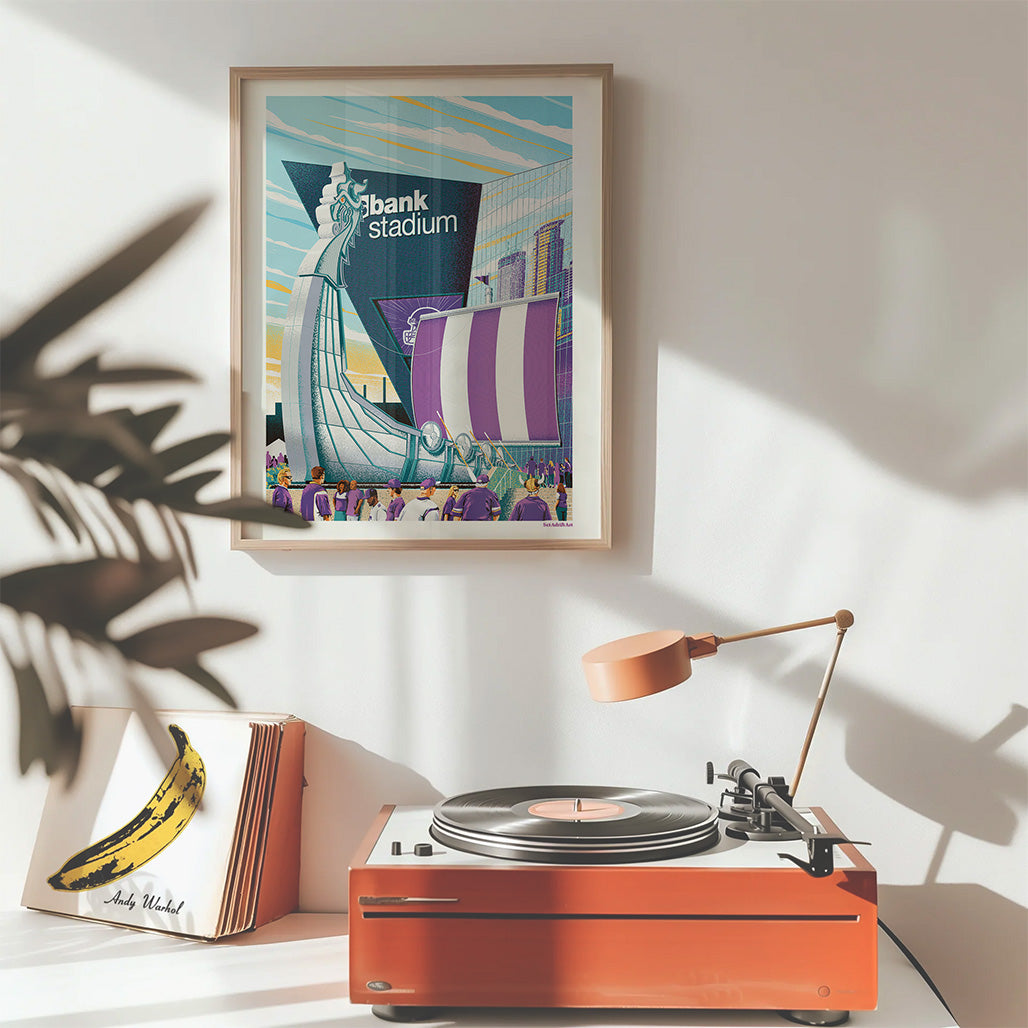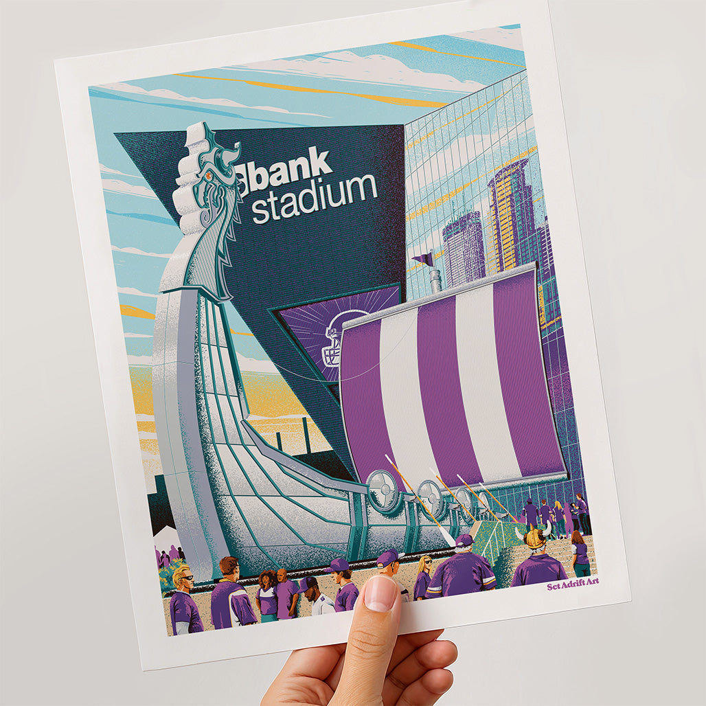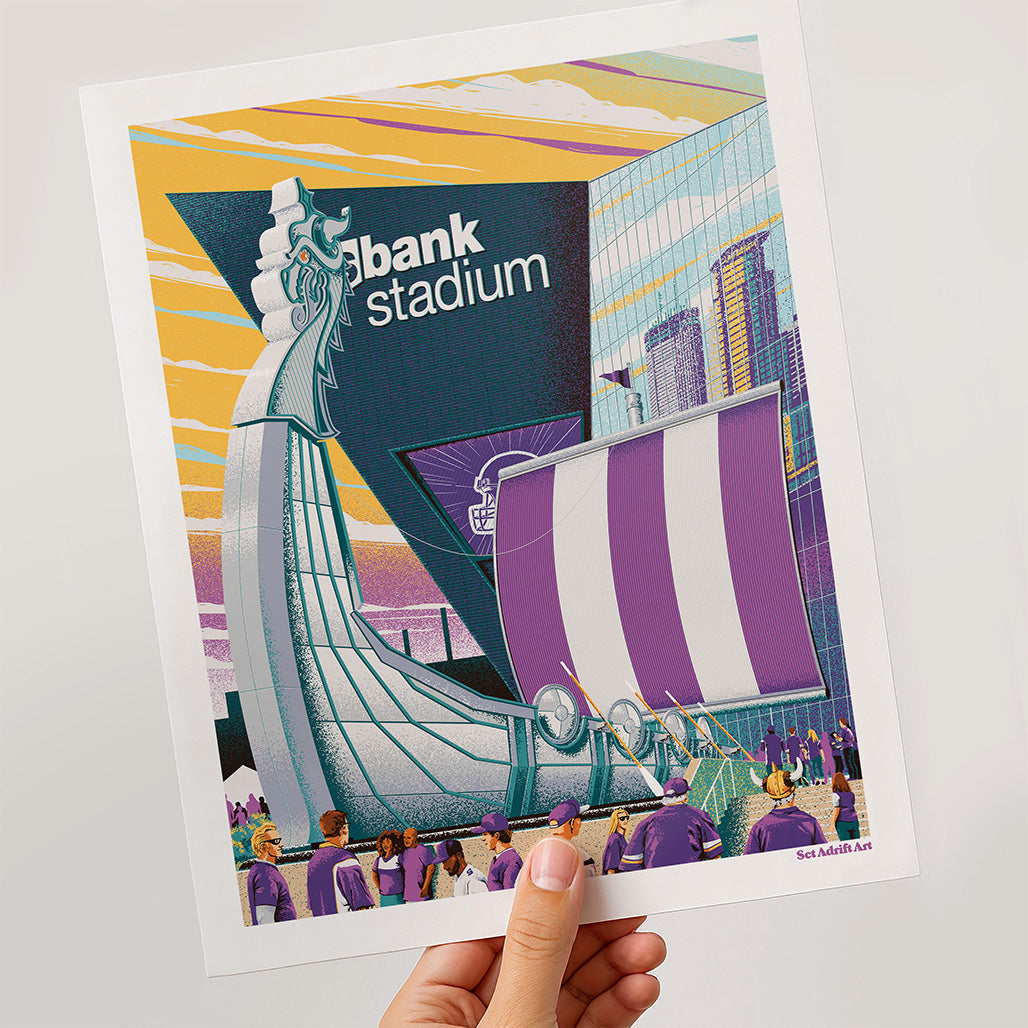 Bright colorful stylized scene of the Vikings Stadium in downtown Minneapolis.