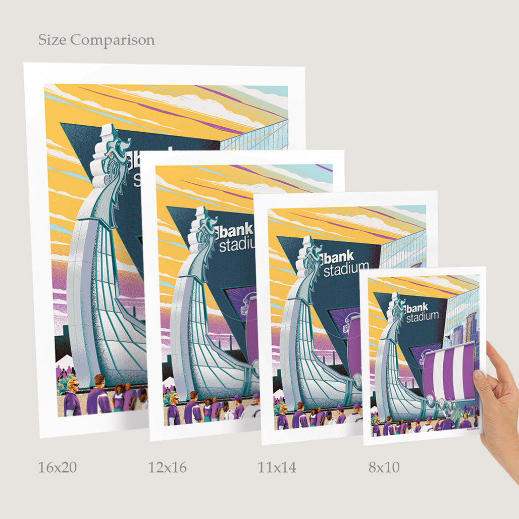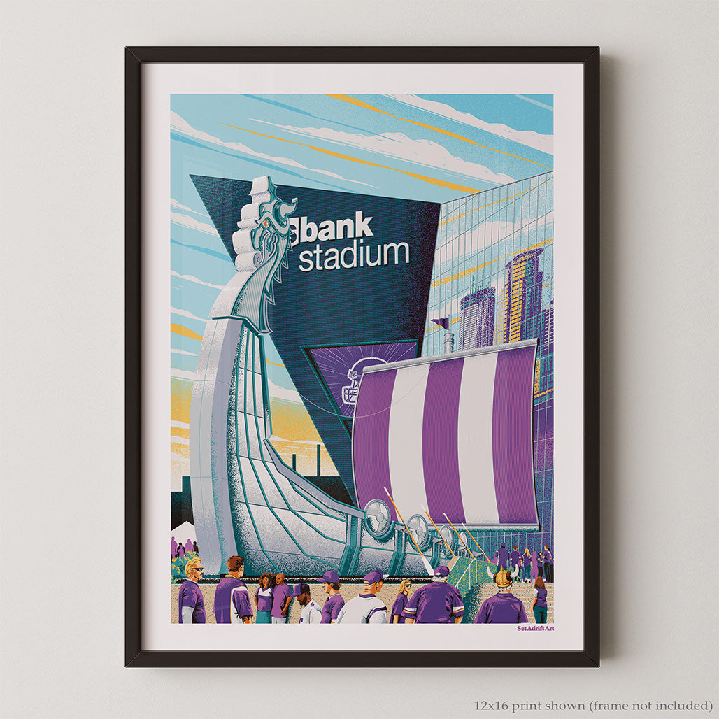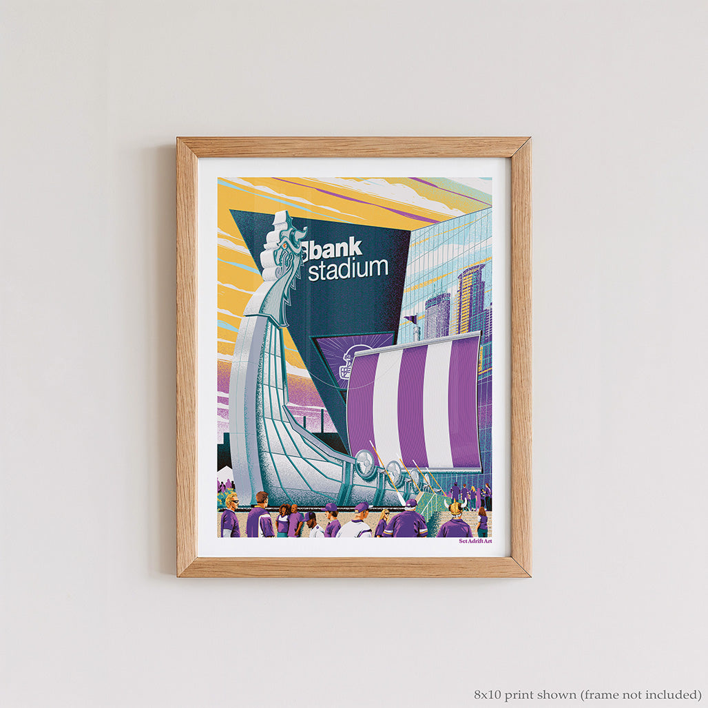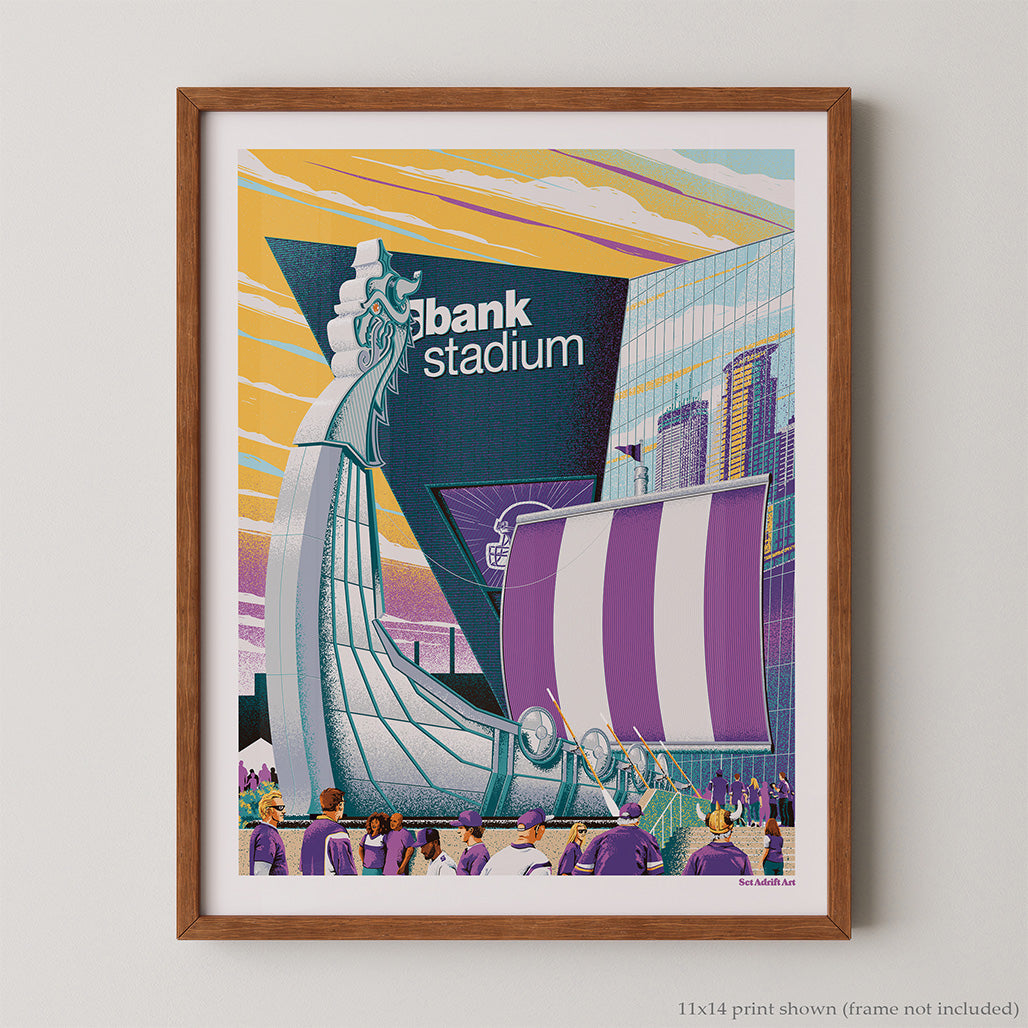 Bright colorful stylized scene of the Vikings Stadium in downtown Minneapolis.