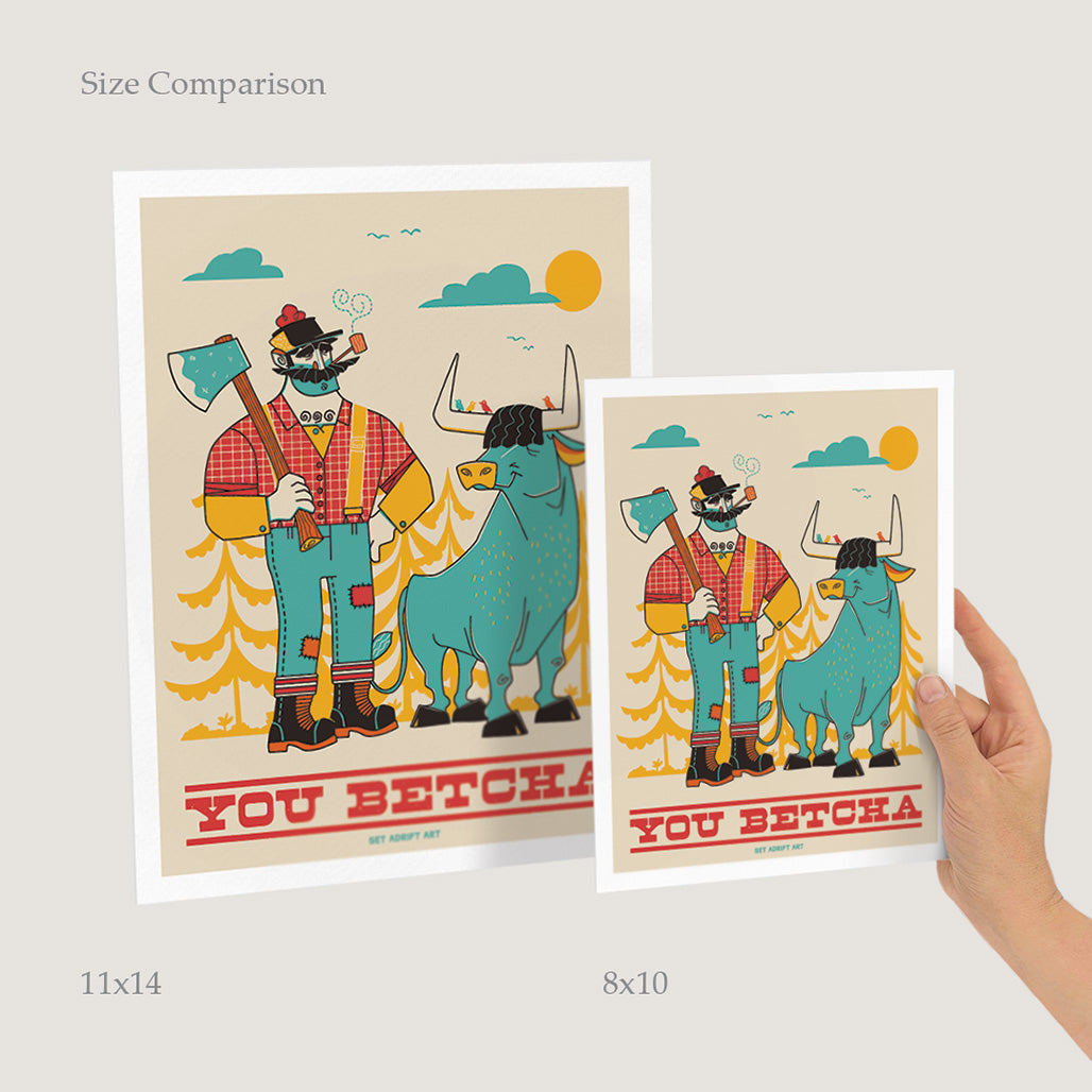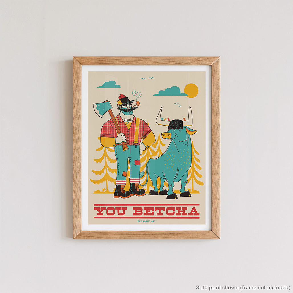 This colorful art print features the legendary Paul Bunyan and his trusty blue ox, Babe, standing proud with a classic Upper Midwest wink: “You Betcha.” A playful tribute to Minnesota folklore and our unofficial state motto, this piece brings lumberjack energy and Minnesota nice to your walls.