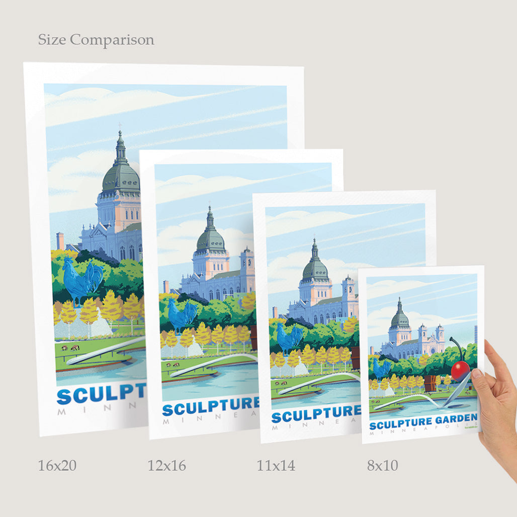 A vibrant tribute to one of Minneapolis's most beloved landmarks—the Sculpture Garden. This colorful art print features the iconic Spoonbridge and Cherry, with the striking Hahn/Cock (rooster sculpture) and the historic Basilica of Saint Mary in the background.